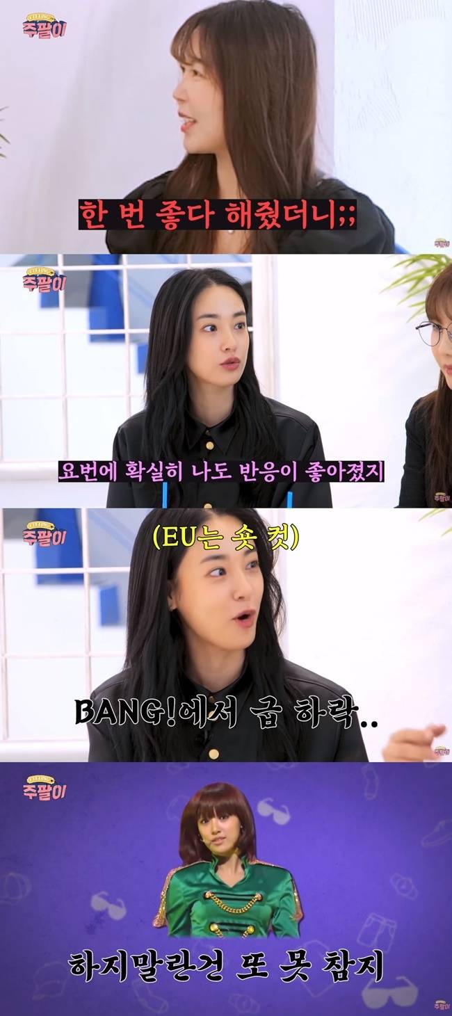 이주연은 "'Diva'때 인기가 올라가다가 '뱅(Bang) !'에서 급락했다. 머리를 잘라버려서"라고 털어놨다. 이에 정아는 "'뱅' 때 갑자기 애가 못생겨졌다. 머리를 잘라버려서 애가 어딘가 잘못돼버렸다"고 농담을 건넸다. (사진-유튜브 채널 피팅 주팔이)