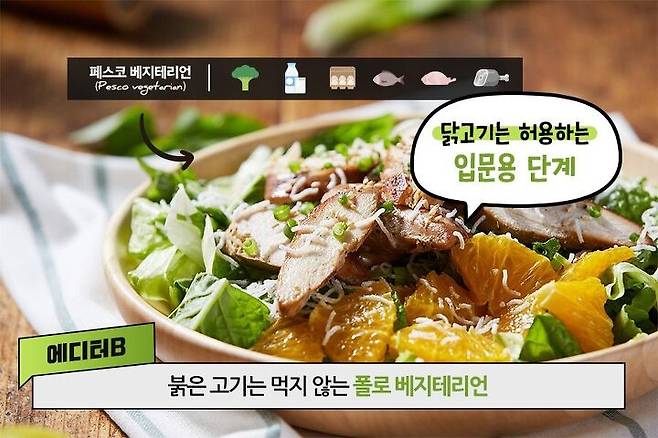 폴로 베지테리언은 준채식주의자라 불립니다. 닭고기처럼 가금류는 먹지만, 돼지고기나 소고기와 같은 붉은 육은 먹지 않기 때문인데요. 붉은색 고기만 금지되기 때문에 먹을 수 있는 음식의 폭이 넓고, 큰 어려움 없이 수행할 수 있어요. 채식을 처음 시작하는 분들이 거쳐가는 입문용 단계라고 볼 수도 있습니다.