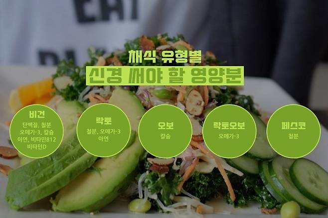채식을 결심했다면 채식 유형에 따라 부족한 영양을 보충해 줘야 해요. 조금만 신경 써도 채식 식단으로 충분히 보충이 가능한데요. 비타민 B12는 '김'으로 보충할 수 있어요. 김에는 100g당 무려 133.8㎍(마이크로그램)이라는 엄청난 양의 비타민 B12가 들어있기 때문입니다. 단백질은 다양한 콩 종류에서 얻을 수 있고, 칼슘은 케일 같은 녹색 채소에 풍부하게 들어있죠. 오메가-3는 올리브오일과 아마씨에서 보충 가능해요. 아마씨는 식물 중 오메가-3 함량이 가장 높은 식품으로 고등어의 44배나 들어있습니다. 채소를 통해서도 철분을 충분히 섭취할 수 있어요. 브로콜리는 다른 채소보다 철분이 2배 이상 함유되어 있고, 비타민 C가 들어 있어 철분 흡수를 촉진합니다.
