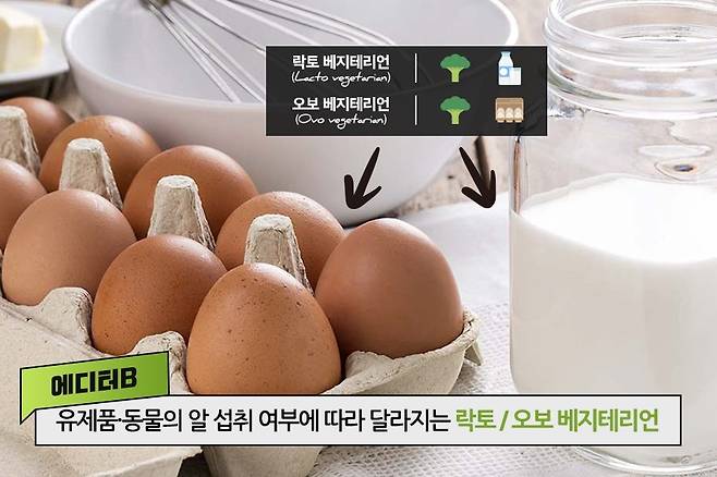유제품과 동물의 알(ex. 달걀)을 먹냐 안 먹냐에 따라 채식 유형이 3가지로 나뉩니다. 락토 베지테리언은 고기와 동물의 알은 먹지 않지만 유제품은 먹어요. 꿀도 포함되죠. 주로 인도나 불교, 지중해 연안에서 많이 보이는 유형입니다. 불교에서는 유제품은 살생으로 얻는 식품이 아니라고 보기 때문에 허용하고 있어요. 다만, 종교적으로 치즈는 허용하지 않는다고 하는데요. 치즈를 만들 때 송아지를 도축해서 얻을 수 있는 레닛이라는 성분을 사용하기 때문입니다. 오보 베지테리언은 유제품은 먹지 않으며 동물의 알과 꿀을 허용합니다.