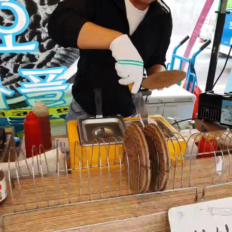 익숙한 듯 낯선 와플 기계에 반죽을 구워서