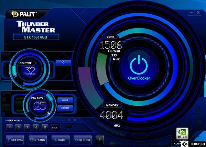 기본적으로 엔비디아의 지포스 그래픽카드는 사용자가 임의적으로 설정할 수 없다. 하지만 Palit 제조사의 그래픽카드는 제조사가 자체적으로 제공하는 오버클럭 유틸리티인 '썬더마스터(ThunderMaster)' 프로그램을 공식적으로 지원해서 오버클럭은 물론 다양한 부가 기능을 사용할 수 있다.