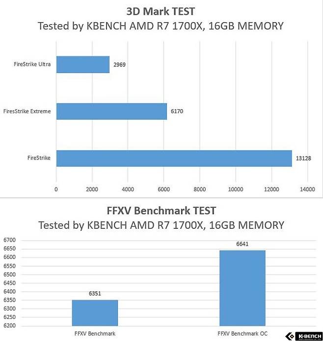 FFXV 벤치마크 프로그램에서도 높은 점수를 기록했으며, 제조사에서 제공하는 오버클럭 유틸리티를 통해 메모리를 MHz, GPU 클럭을 155MHz 오버클럭하니 소폭의 점수 향상을 확인할 수 있었다.