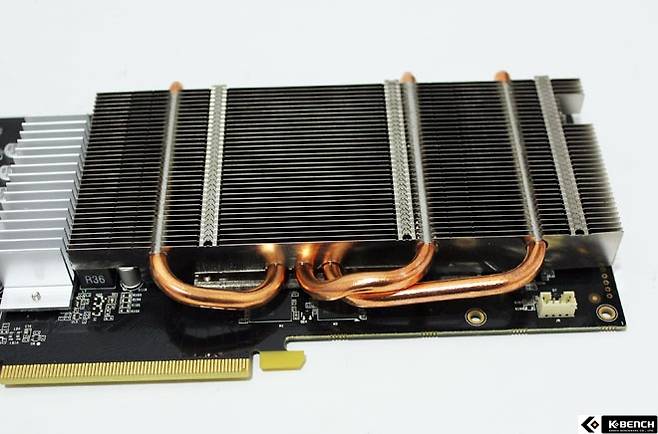 또한, 쿨러 내부에는 GPU 칩셋을 덮고 있는 히트 씽크와 3개의 구리 재질의 히트파이프가 3개 탑재되어 있어 쿨링 효율을 높이고 있다.