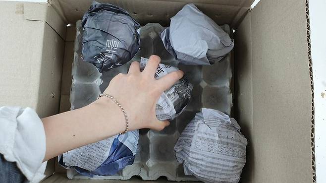 구멍을 뚫어놓은 상자에 달걀판을 넣고 신문지로 싼 양파가 서로 맞닿지 않게 놓아주세요. 신문지는 수분을 흡수해서 양파가 쉽게 무르지 않도록 도와줍니다. 보관 중에 신문지가 눅눅해지면 신문지만 교체해주세요.