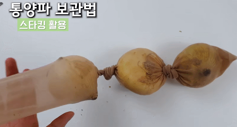 양파를 스타킹에 넣고 사이사이에 매듭을 지어줍니다. 이대로 보관하면 필요한 부분만 싹싹 잘라서 쓸 수 있어 좋아요. 딱 한 번 신었는데 올이 나가버려서 버리기 아까운 스타킹은 이렇게 활용하면 딱이죠?