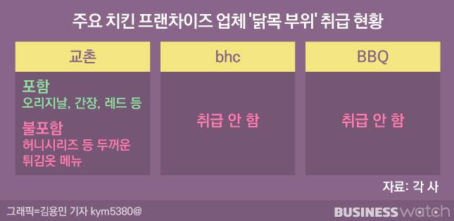 두 업체 모두 뚜렷한 이유가 있었던 건 아니라고 설명합니다. 닭목 부위를 팔면 법에 저촉된다거나, 아니면 이런 '결정'을 하게 된 특정 사건이 있었던 건 아니라는 의미입니다. 다만 사람들이 목뼈를 선호하지 않고, 때로는 혐오 부위로 여기는 이들도 있기 때문에 취급하지 않는다고 설명했습니다. 두 업체뿐만 아니라 많은 프랜차이즈 업체에서 이런 이유로 목뼈를 빼는 경우가 많다고 합니다.