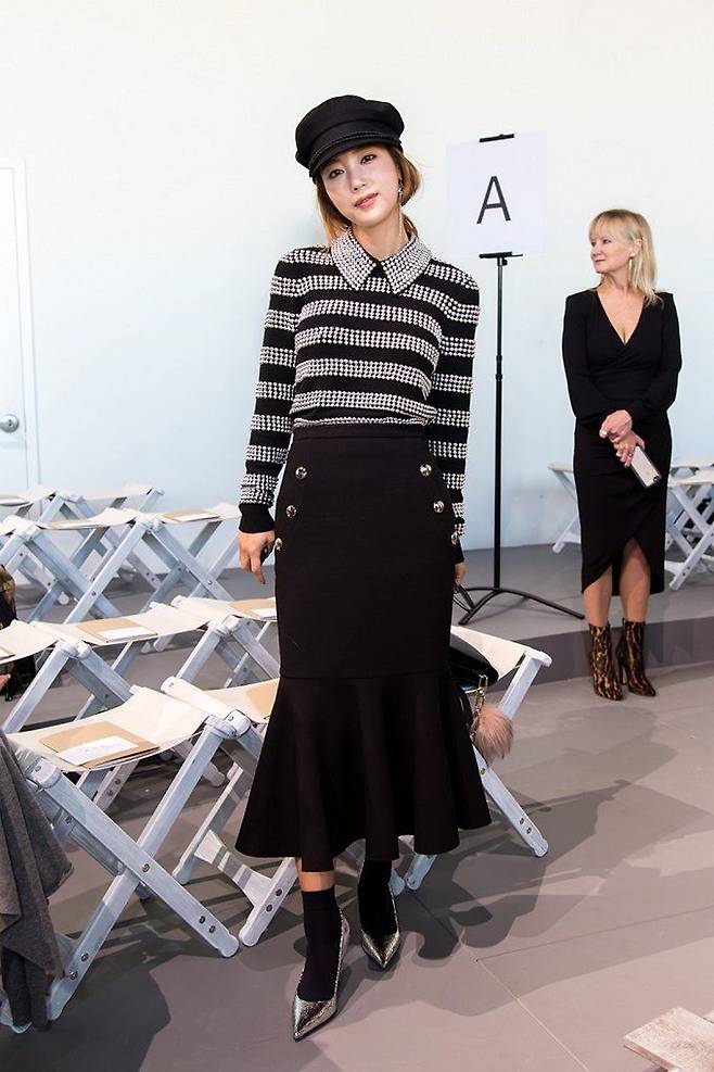 국내 슈퍼 셀럽으로 불리는 기은세는 감각적인 블랙&실버 스타일링으로 뜨거운 스포트라이트를 받았다. 머메이드 라인 블랙 롱 스커트에 비즈 장식이 스트라이프 형태로 들어간 니트를 코디해 트렌디한 매력을 발산했다. 여기에 블랙 뉴스보이캡으로 마무리해 전체적인 룩에 위트를 더했다.