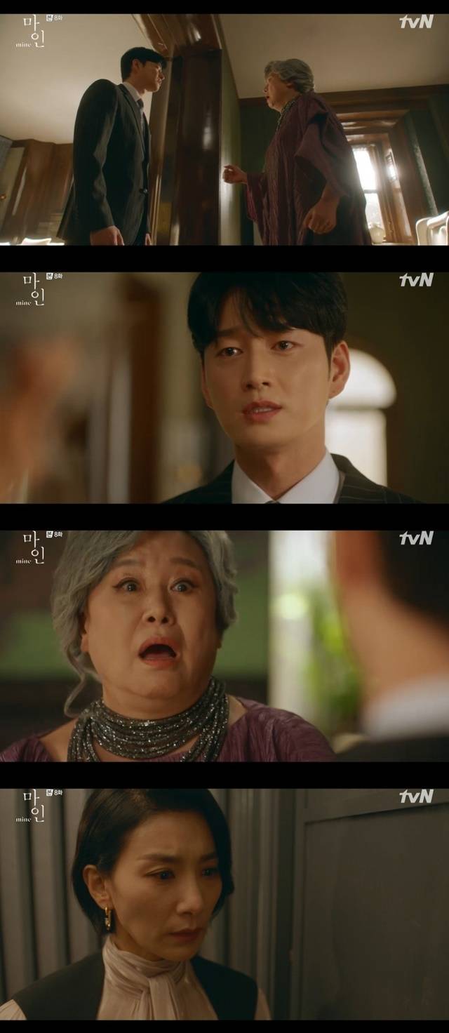 실상 한지용은 서희수와 연애 중 전연인 이혜진이 제 아이를 낳은 사실을 알고 이혜진을 죽은 사람 만든 장본인. 양순혜가 “네가 그런 거잖아”라며 황당해 하자 한지용은 “혹시 아프세요? 치매 검사 한 번 받아보셔야 겠다”며 양순혜를 치매로 몰았다. 정서현(김서형 분)은 그 대화를 엿듣고 한지용의 섬뜩한 실체를 알았다. (사진=tvN ‘마인’ 캡처)
