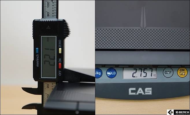 두께의 경우에도 최대한 슬림한 구성을 보여준다. 제품 광고 DB에서는 14mm라 소개되는 부분이 있지만, 하판의 받침 부분까지 고려하지 측정 이기에 실제로 중간부분정도를 버니어캘리퍼스로 측정 해보았다.