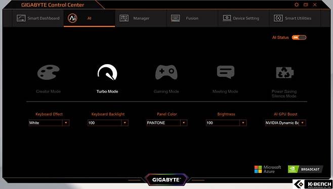 일단 기본적으로 제공되는 기가바이트 컨트롤 센터에는 기가바이트 AERO 17 HDR YD i7 모델이 지원하는 다양한 기술들을 ON/OFF 할 수 있고 상태를 모니터링 할 수 있다.