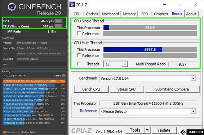 이미지 렌더링을 통해 성능을 알아볼 수 있는 시네벤치R20과 싱글/멀티코어 성능 점수를 알아볼 수 있는 CPU-Z 자체 벤치 테스트를 진행했으며, 이전 인텔 10세대 모바일 최상위 제품과의 간단한 비교자료를 준비해보았다.