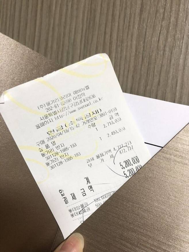 불가리 뉴비비의 현재 가격은 로즈골드에 플래티넘으로 하면 537만원이라고 해요. 저의 구매 가격은 4월 기준으로 영수증에 나와 있어요. 현재는 4월보다 17만원 인상되었다고 하네요. 아무래도 다이아몬드가 꽤 큰 사이즈여서 그런 것 같아요. 참깨 다이아몬드 박힌 것은 백화점 브랜드인데도 저렴하긴 하지만 평소 반지를 잘 끼지 않고 욕심이나 로망이 없기에 웨딩밴드에 왕 다이아를 몰기로 했어요.