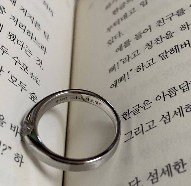 웨딩반지에 각인을 많이 하길래 우리도 뭘 할까 엄청 고민했었다. 각인은 반지 계약하고 일주일? 정도 까진 고민이 가능하다고 했다. 영어 이니셜을 하기도 하고 결혼기념일 날짜로 하기도 하던데 뭔가 땡기지 않았다. 어쩌다가 본 포스팅에서 한글 각인을 했던데 너무 예뻤다. 그뒤로 한글에 꽂혔다.