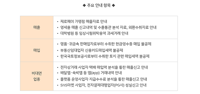 또한 최근 매출이 증가한 전자상거래 업종 등은 외부 과세자료와 현장정보 등을 수집·분석해 그 특성에 맞는 개별 분석자료를 17만 개 법인에 추가로 제공합니다.