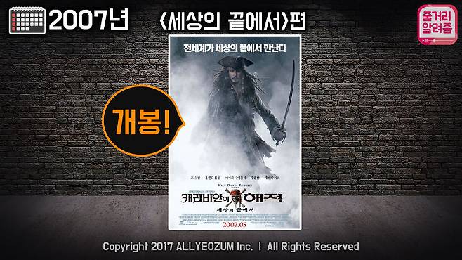 2007년에 개봉한 <세상의 끝에서> 편은, 데비 존스의 심장으로 플라잉 더치맨을 손에 넣은 동인도회사가 전 세계의 바다를 점령한 시점을 배경으로, 잭과 윌이 커틀러와 데비 존스에 맞서 싸우는 내용입니다.