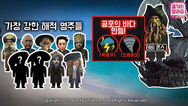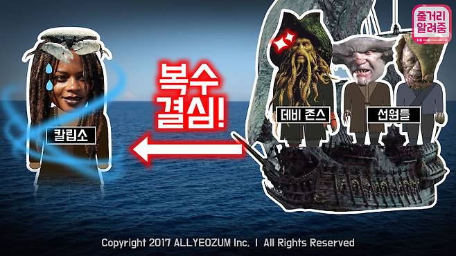 이로 인해 본인은 물론 선원들까지 흉측한 바다괴물이 되어버렸습니다. 이후, 복수를 결심한 데비 존스는