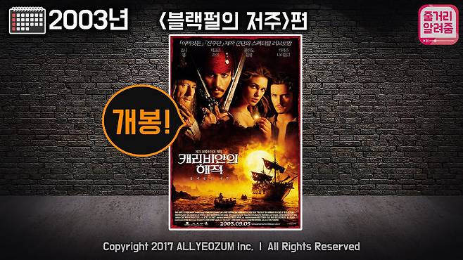 2003년에 개봉한 <블랙펄의 저주> 편은, 선상반란 10년 후를 배경으로, 아즈텍 금화의 저주 때문에 10년째 해골로 살고 있던 바르보사와 블랙펄 선원들에게, 잭이 복수를 하는 내용입니다.