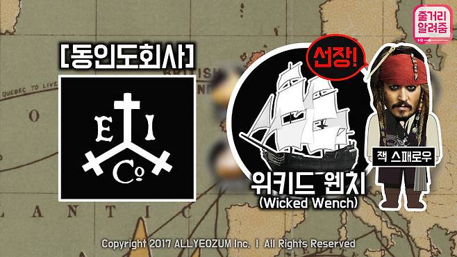 한편, 이 당시 영국 왕실은 식민지 무역과 해적 소탕을 목적으로, 현역 군인과 전역 군인들로 구성된 “동인도회사”를 출범시킨 상태였는데요. 이 동인도회사가 소유했던 갤리온 중 하나인 “위키드 웬치”(Wicked Wench)호의 선장이 바로, “잭 스패로우”였습니다.