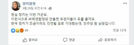 하지만 양이원영이 인터넷에서 유명해진 건 조금 다른 이유 때문이었는데, 더불어시민당 합류 직전 올린 아래의 글 때문(…)