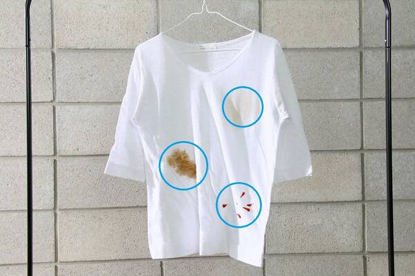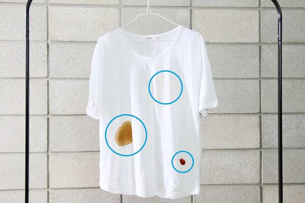 가루세제와 액체세제로 세탁을 하기에 앞서 일상생활에서 옷에 묻히기 쉬운 커피와 간장, 케첩으로 얼룩을 만들어보았다. 흰색 티셔츠의 우측 상단에는 커피를, 좌측 중단에는 간장을, 우측 하단에는 케첩을 묻혀보았다.