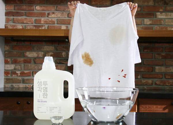 최근 액체세제가 인기를 얻고 있다. 옷에 심한 얼룩이 생겼을 때, 얼룩 위에 직접 세제를 묻혀 더욱 효과적으로 얼룩을 제거할 수 있기 때문이다. 이에 액체세제를 이용해 직접 세탁을 해보았다. 이번에도 역시 흰색 티셔츠의 우측 상단에는 커피를, 좌측 중단에는 간장을, 우측 하단에는 케첩을 뿌려보았다.