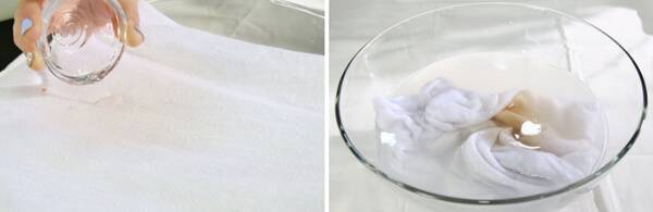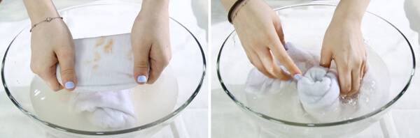 약 15분이 지난 후 옷을 확인해보니, 얼룩의 색상이 옅어졌다. 또한 얼룩의 색상이 빠지면서 세제를 푼 물의 색상도 변했다. 얼룩을 완벽하게 제거하기 위해 옷을 비벼 빨고, 깨끗한 물에 헹궈냈다.