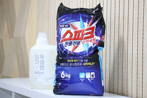 오늘의 첫 번째 실험 준비물인 가루세제가 등장했다. 평소 가루세제를 사용할 때는 세탁기를 이용하는 것이 보편적이지만, 찬물에도 잘 녹는 세제라고 해서 얼마나 용해력이 뛰어난지 알아보기 위해 손빨래를 선택했다.