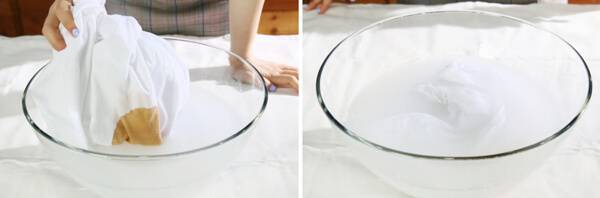 다음으로 가루세제를 푼 물에 얼룩이 가득한 흰색 티셔츠를 담가보았다. 처음 옷을 담갔을 때는 특별한 점을 발견하지 못했는데, 차츰 물의 색이 변하기 시작했다.