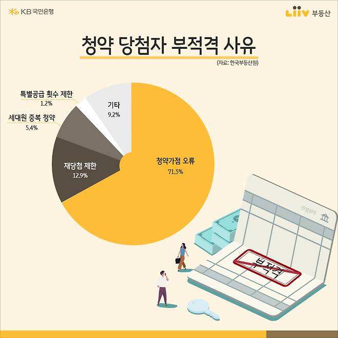 한국부동산원의 자료에 따르면, 최근 5년 동안 무주택 청약 당첨자 총 109만여명 중 10.2%인 11만2,500여명이 부적격으로 당첨 취소된 것으로 나타났습니다. 이에 KB국민은행 리브부동산에서 부적격 사례를 통해 청약 전 유의할 점을 알아봤습니다.