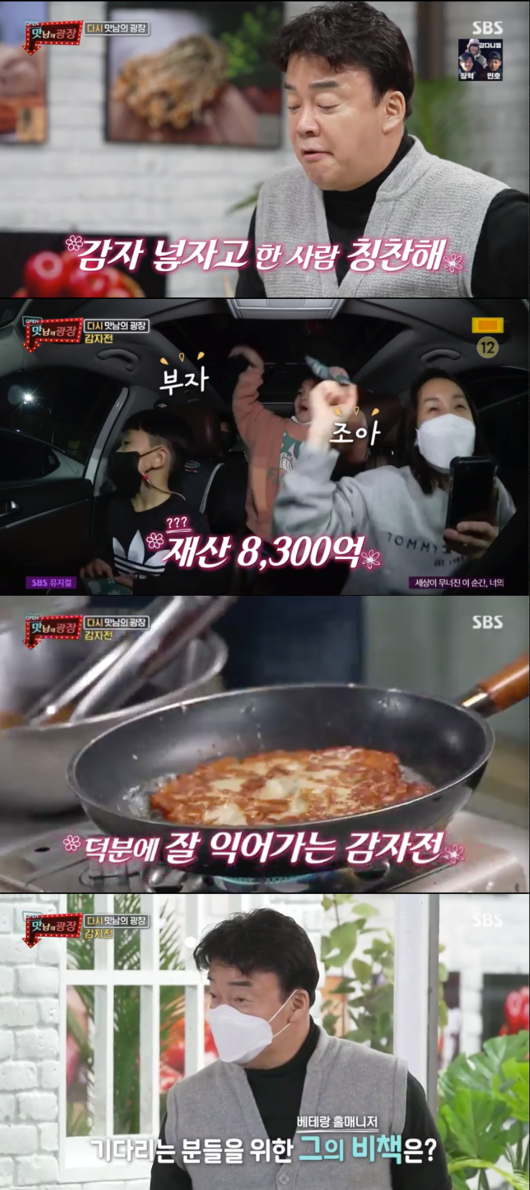 18일 방송된 SBS '맛남의 광장’에서 백종원, 양세형, 김동준, 유병재, 김희철은 게스트 이선빈과 함께 감자과 한돈을 활용한 감자전을 만들어 언택트 광장에서 시민들에게 대접했다.