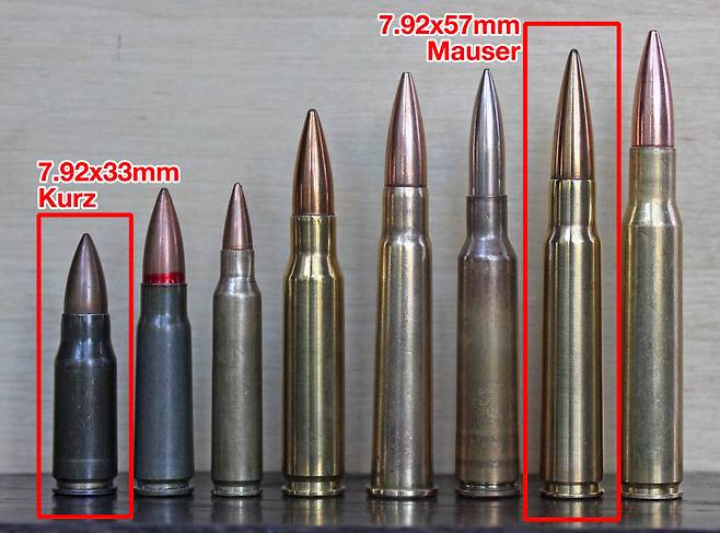 이 총기의 핵심은 바로 '탄약'이다. 위에서 언급한 통상적인 소총탄과 권총탄 사이의 크기를 갖는, 이른 바 '중간탄'을 채용함으로써, 보병간의 일반적인 교전거리에서 충분한 위력을 발휘하면서도 자동사격시의 부담은 기존의 소총탄 대비 크게 줄인 것이다. 이 총기들에 사용된 탄약은 통칭 'K탄'으로 불리는 7.92×33mm 쿠르츠(Kurz)탄으로, 당시 제식소총인 카라비너98K(Karabiner 98 Kurz)에 사용된 7.92x57mm 마우저탄 보다 훨씬 짧은 길이의 탄피와 더 짧은 형태의 탄두를 가졌다.