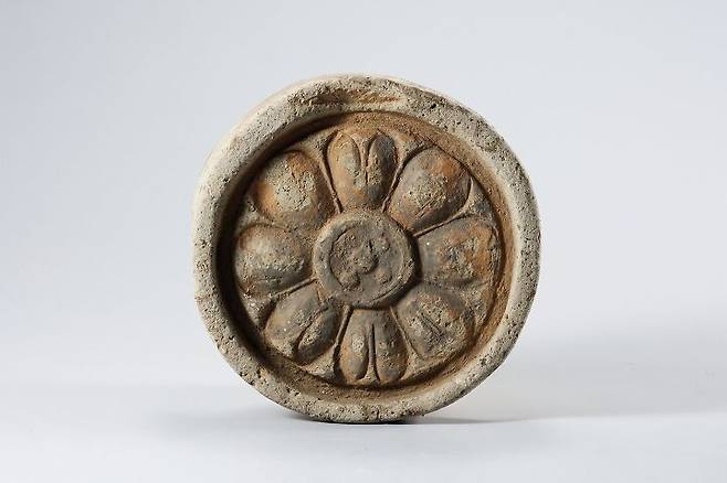막새 면에 두 겹의 원 테두리가 음각되어 있고 바깥 테두리에는 연밥문을, 안 테두리에는 모란문이 양각되어 있다(출처: 국립중앙박물관).