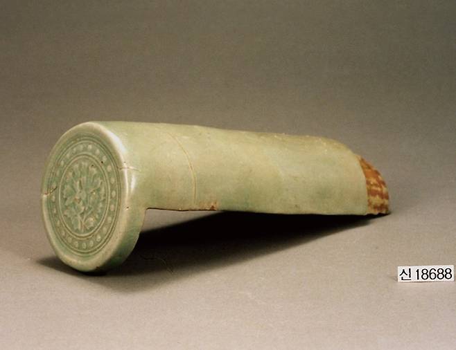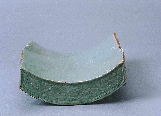 당초무늬가 돋을새김으로 만든 암막새다. 불교가 성행하던 고려는 사찰에서 활발하게 기와를 제작했고, 청자로 만든 청기와는 가장 화려한 기와로 꼽는다(출처: 국립중앙박물관).