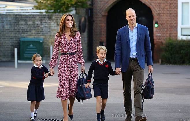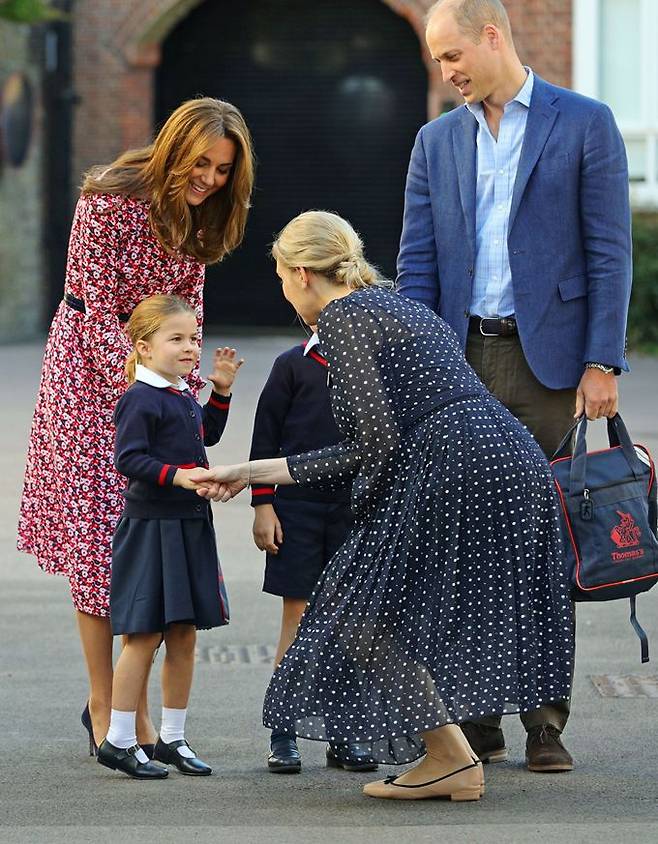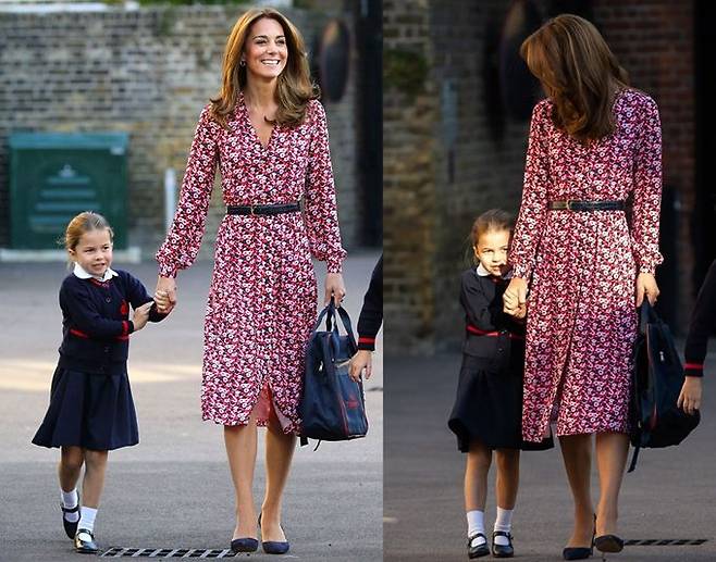 케이트 미들턴의 딸 샬럿 공주가 엄마 손을 잡고 초등학교에 첫 등교했다. 케이트 미들턴은 지난해 5월 입었던 꽂무늬 셔츠 원피스를 다시 착용했다.