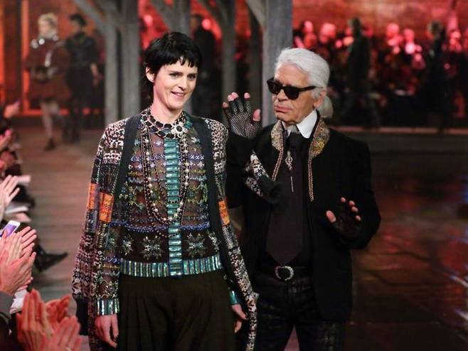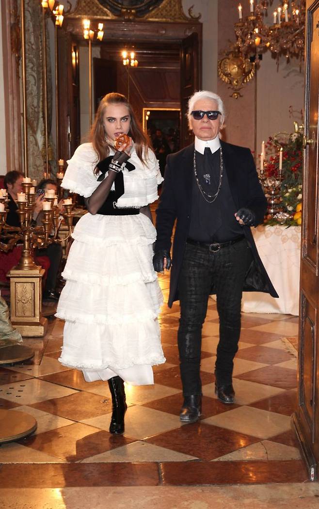 아래 사진은 샤넬의 2014 봄/여름 오뜨 꾸띄르 컬렉션에서 칼 라거펠트가 허드슨 크로닉과 카라 델레바인과 함께 피날레를 장식하고 있다.