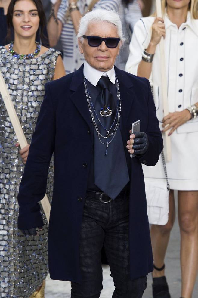 18. 칼 라거펠트는 스펙타클한 패션 쇼 연출로도 유명하다. 파리 그랑 팔레에 마련된 가상 거리 '샤넬대로'에서 진행된 '2015 봄/여름 샤넬 쁘레따뽀르떼 컬렉션'을 통해 칼 라거펠트는 아주 정치적(?)인 시위 모습을 패션쇼 피날레로 선보였다.