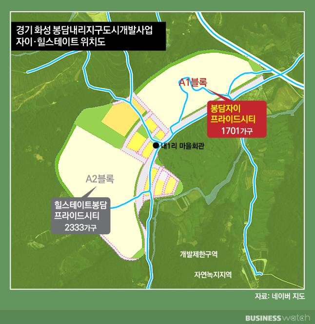봉담 프라이드시티 A1블록은 GS건설(봉담자이 프라이드시티)이 지하 4층~지상 35층, 1701가구로 조성하고 A2블록은 현대건설(힐스테이트봉담 프라이드시티)이 지하 3층~지상 35층, 2333가구로 짓는다.