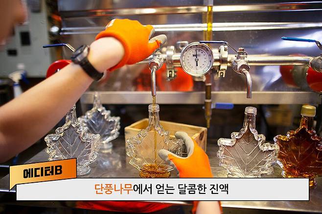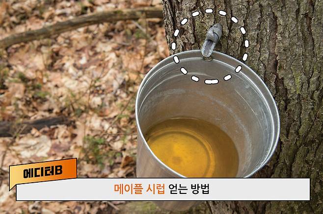 단풍나무 한 그루 당 1년에 십여 리터의 수액을 얻을 수 있어요. 수액은 희미한 단맛이 나는 묽은 액체인데요. 이것을 모아 끓이고 졸이면 메이플 시럽이 됩니다. 많은 분들이 "캐나다에선 메이플 시럽이 싸겠지"라고 생각하지만 캐나다에서도 메이플 시럽은 상대적으로 비싸요. 수확 시기가 정해져있고, 수확 방법이 까다롭기 때입니다.
