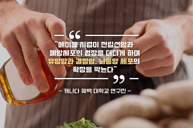 미국 로드아일랜드 대학교 나빈드라 시람 박사팀은 미국화학 학회에서 "메이플 시럽에서 항암, 항균, 항당뇨 효능이 있는 새로운 항산화 물질 13가지를 발견했다"라고 밝혔어요. 메이플 시럽에 풍부하게 든 식물 호르몬인 '아브시스산'은 식물의 성장을 억제하는 작용을 합니다. 음식을 통해 체내로 들어오면 암세포의 성장을 더디게 하고 전이를 막는 겁니다.