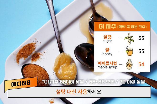 메이플 시럽의 당도는 설탕의 2/3 정도예요. 설탕 2스푼 대신 메이플 시럽 2스푼을 넣으면 당분 섭취를 줄일 수 있죠. 거기다 메이플 시럽의 GI 지수는 54로 낮은 편에 설탕이나 꿀보다 낮은 편에 속합니다. 메이플 시럽에는 포화지방과 콜레스테롤은 없으며 소금도 거의 들어있지 않아요.
