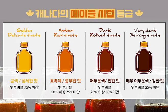 색과 풍미에 따라 등급이 나뉘는데요. 금색으로 빛 투과율이 높을수록 고급이며 등급이 낮을수록 향이 진해요. Dark 등급은 바로 먹기보다는 요리용으로 사용하고, Very dark는 색이 어둡고 풍미가 강해 상업적 식품 첨가물로 쓰입니다. 색도 이쁘고 활용도가 좋은 Amber가 가장 인기가 많아요.