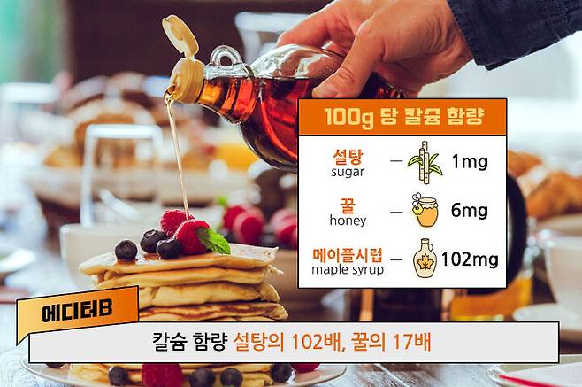 메이플 시럽에는 칼슘이 풍부하게 들어 있어요. 설탕의 102배, 꿀의 17배에 달하는 양이죠. 100g당 우유의 칼슘 함량이 125mg인 것에 비하면 결코 적은 양이 아닌데요.