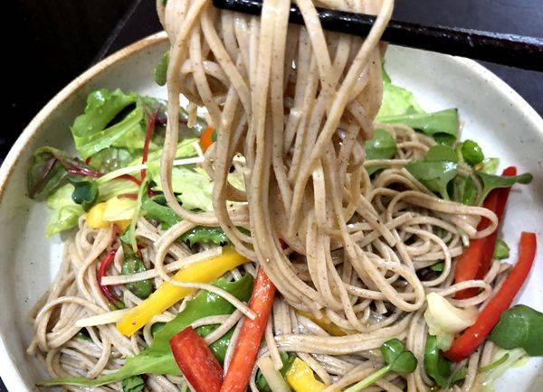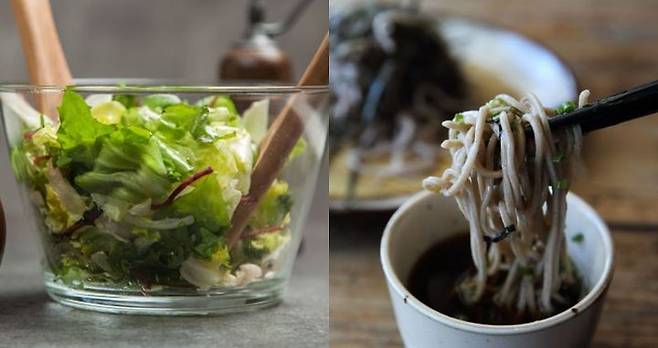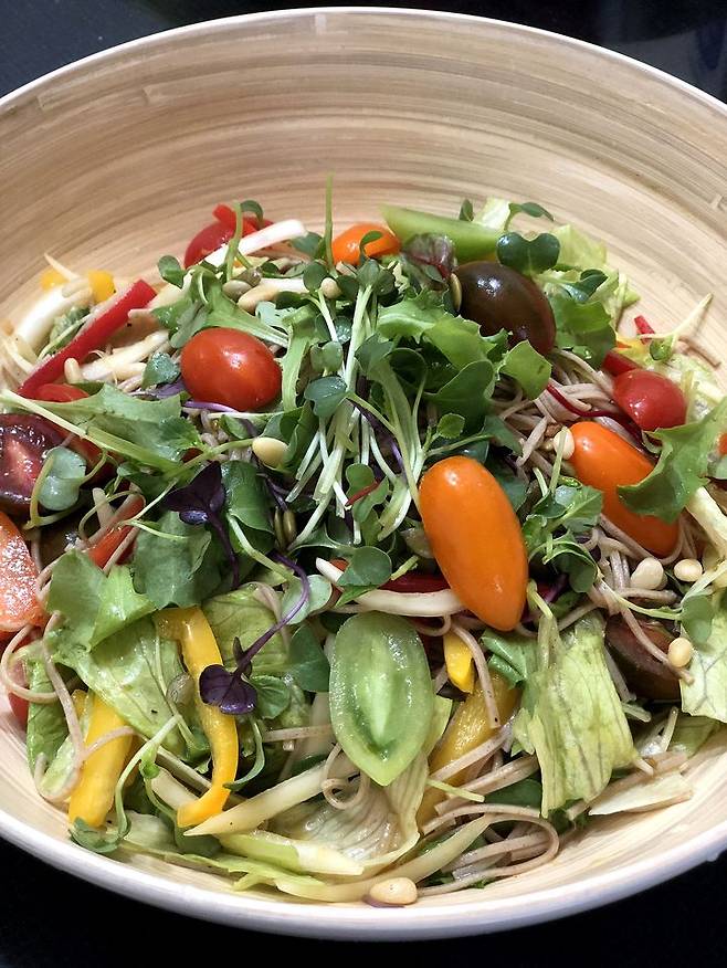 하나씩 뜯어보면 그리 특별한 구석이 없어 보여도, 메밀국수와 샐러드의 만남은 흔히 벌어지는(?) 일은 아니죠.