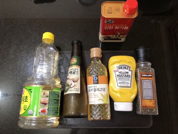 - 굴소스, 머스터드, 참기름, 올리고당, 식초를 1큰술씩 떠서 한데 섞고 후추를 뿌리면 된다. 풍성한 소스맛을 보려면 1.5큰술씩 섞는다.