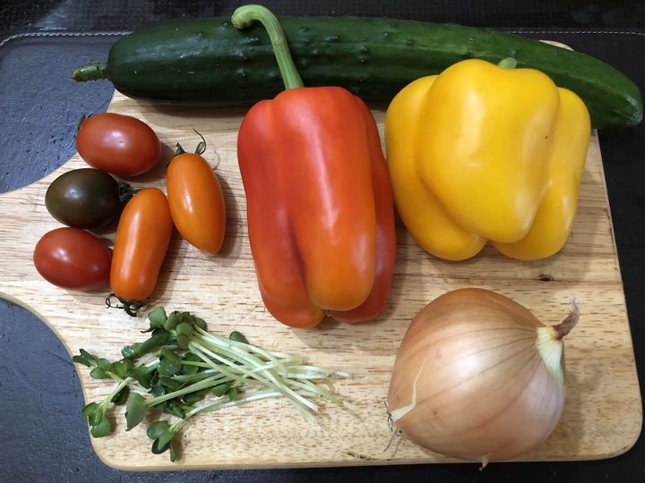 - 파프리카와 양파는 채썬다. 로메인, 양상추는 한입에 들어갈 크기로 자른다. 방울토마토는 반으로, 오이는 반달모양으로 잘라둔다.