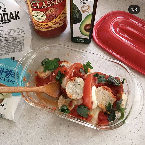 재료: 완조리 닭가슴살 100g, 완숙토마토 1개, 슬라이스 모차렐라 치즈 1장, 토마토소스 2큰술, 깻잎 2장(또는 생바질), 올리브 오일 2작은술(또는 아보카도 오일)