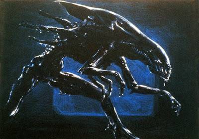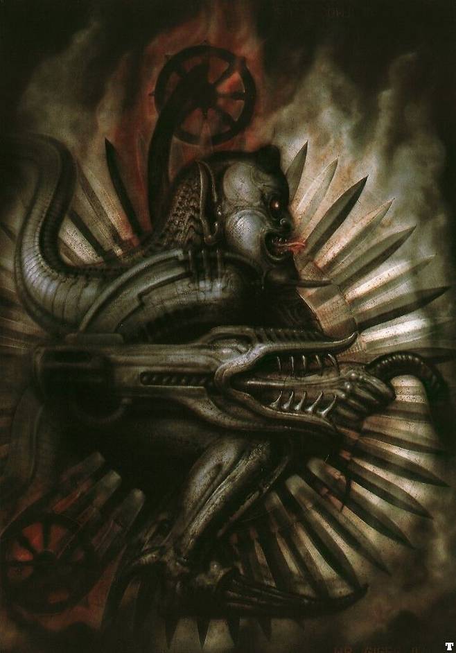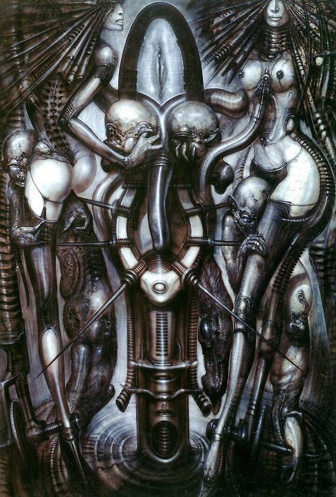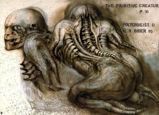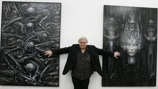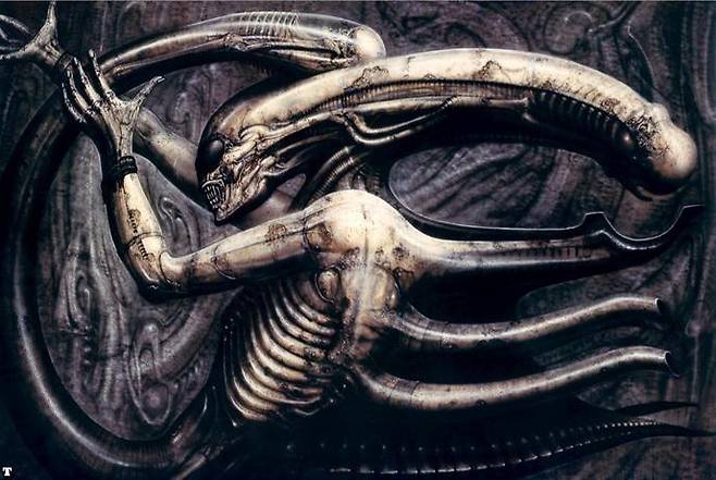 이런 괴이한 생명체를 디자인한 사람은 한스 루에디 기거(1940~2014), 일명 H.R.기거라 하는 스위스의 화가입니다. 인간과 기괴한 생명, 그리고 기계를 조합한 듯한 그림이 특징인 그는 세상 어디에서도 볼 수 없는 독창적인 디자인으로 에일리언 뿐 아니라 여러 SF나 호러 영화의 콘셉트 디자인에 참여한 작가이기도 합니다.