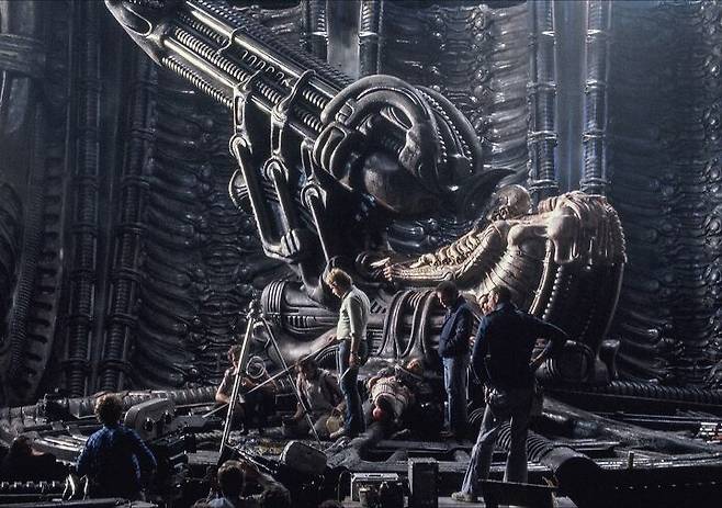 1979년, 때마침 <스타워즈> 덕분에 불어닥친 SF 영화 붐에 힘입어 <에일리언>도 영화 제작을 시작하게 되었습니다. 이때 댄 오배넌은 기거를 1편의 감독 리들리 스코트에게 추천했고, 감독의 마음에도 들었던 기거는 에일리언 뿐만 아니라 영화 초반에 에일리언의 알을 발견하게 되는 미지의 우주선과 우주 유적, 그리고 ‘스페이스 조키(Space Jockey)’라는 외계인의 시체까지 디자인하게 됩니다.