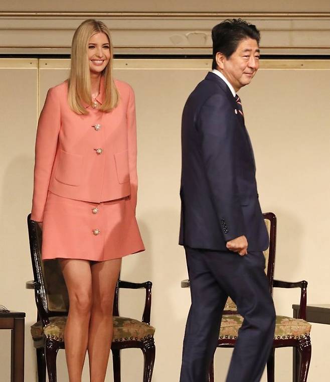 ↑사진 = 2017년 11월 도쿄 '국제여성회의(WAW) 2017’ 참석 당시 일본 아베 총리와 저녁 만찬때 착용한 드레스